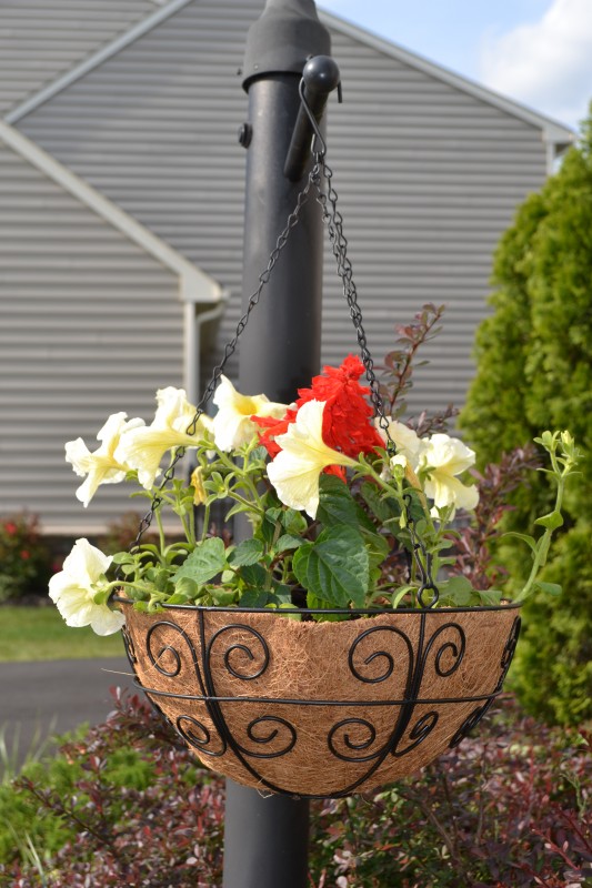 Have you noticed planters with coconut husk hanging basket liners in every garden center? Ever used them? I have. Last summer…..bought a coco lined hanging planter from Big Lots for $4.99. Planted red and white petunias and hung it on the lamp post rod outside.