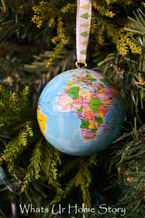 Anyhoo…that craft fail made me realize that I would have an equally tough time Mod Podge-ing the map in one piece around the round ornament. And the idea was shelved but not for too long. On my next visit to Michaels I came across this globe ball ($2). It is in the kids’ plastic toy section, you know those bins with tons of animal figurines. It was the perfect size for an ornament! All it needed was a hook and some pretty ribbon. IPhone pics alert!