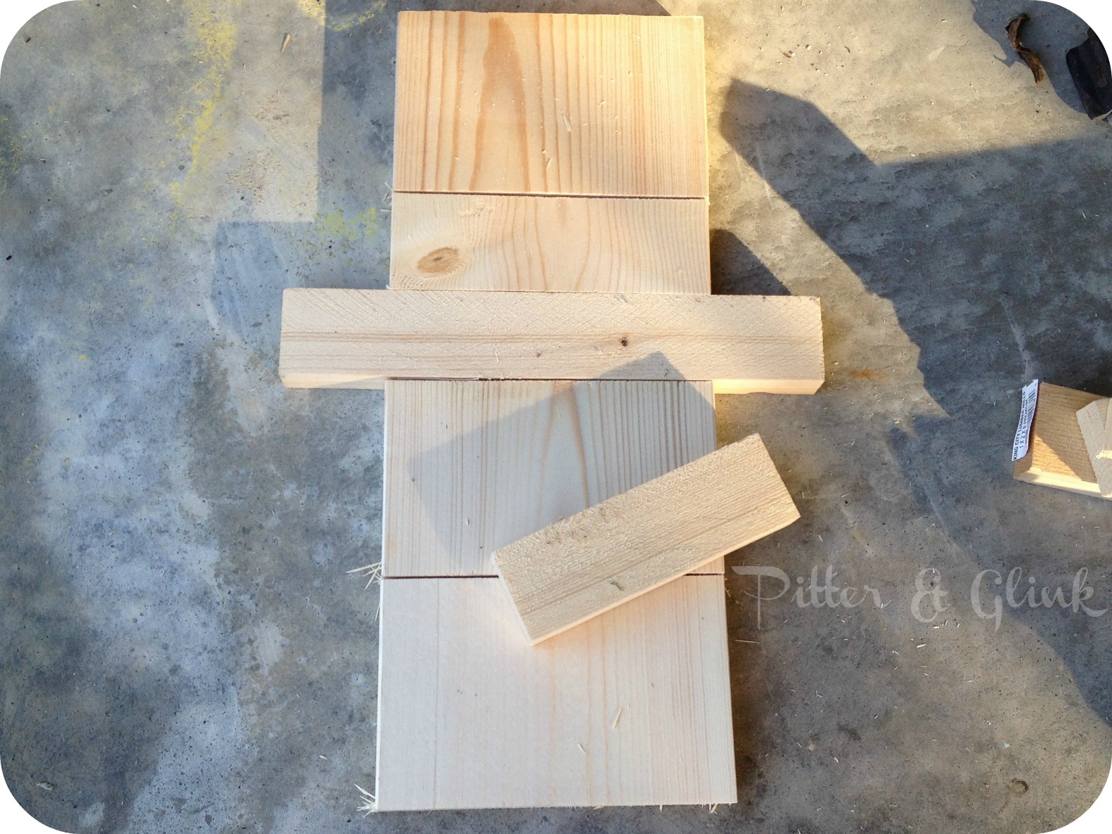 Like I said, I started this project with scrap wood: pieces of 1×2’s and 1×6’s. I arranged the pieces into a snowman shape.