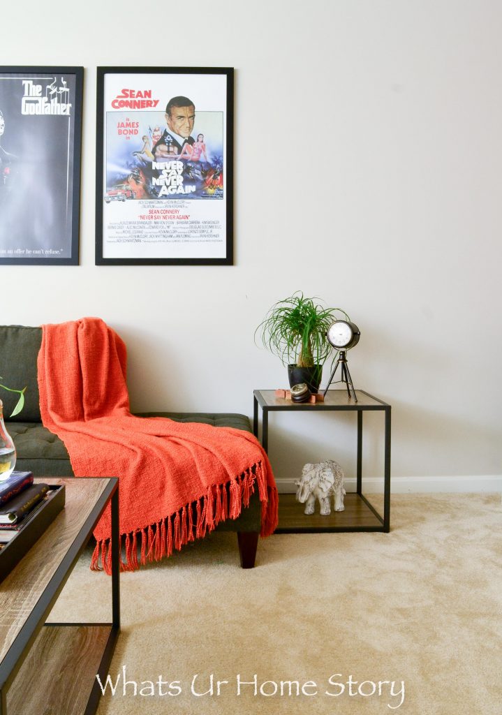 I love that these tables have a bottom shelf for extra storage or to display knickknacks. The gun metal gray finish works really well with the room’s vibe and continues the modern tone set by the exposed brick accent wall.