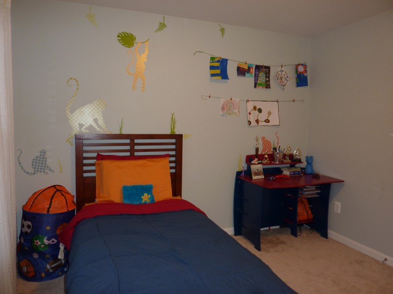 Paint – $26.99 (1 gallon, BM Gray Cashmere matched to Behr Flat at Home Depot) Twin Bed – $199.99 – JCPenny (free shipping for ship to store) Mattress – $149 – Costco Comforter – $19.99 – TJMAXX Bedding – $15.99 – TJMAXX Small Blue Pillow – already had (was a gift from preschool) Monkey Wall DecalsUpdate: The room has since been updated to reflect the tastes of my tween son.